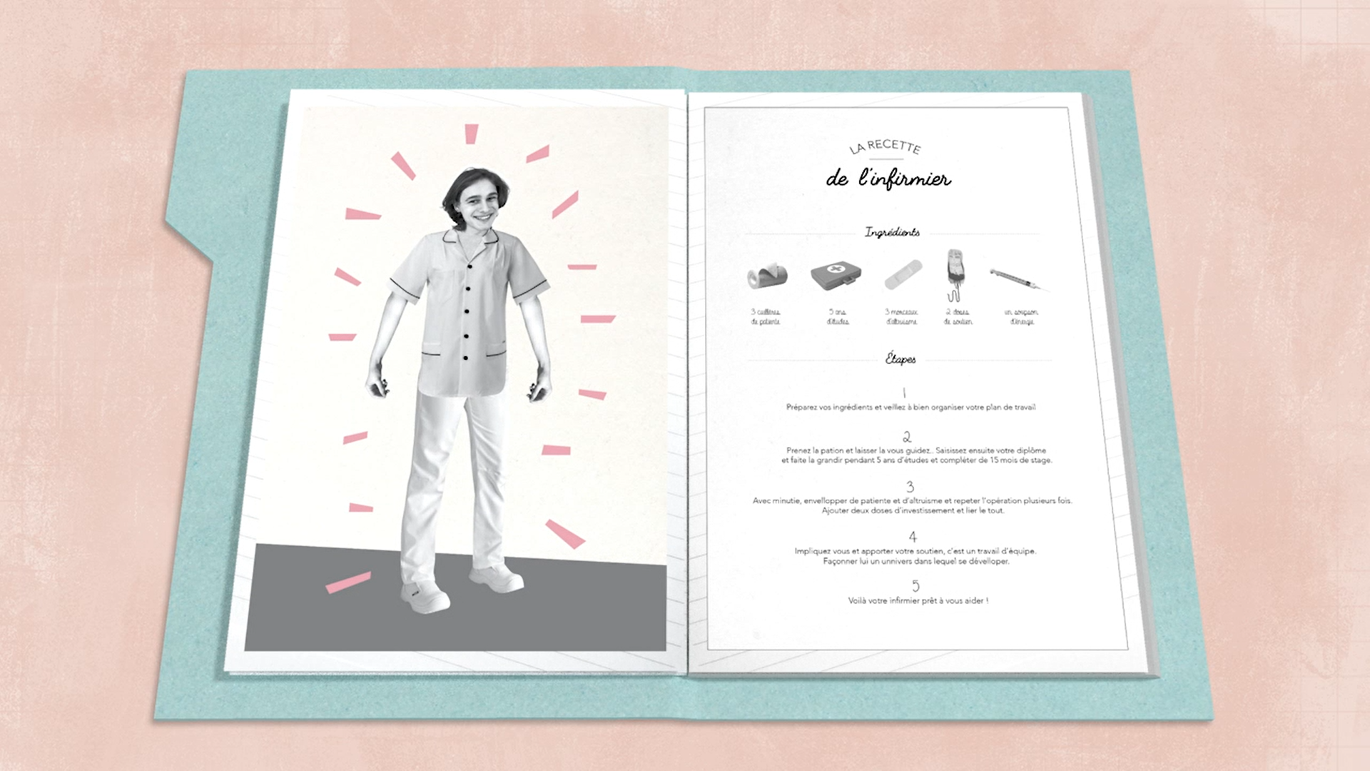 Vidéo expliquant la façon de devenir un infirmier suivant les étapes d'une recette de cuisine. Travail effectué en groupe durant mon année de Bachelor Motion Design pour l'Ordre National des Infirmiers.